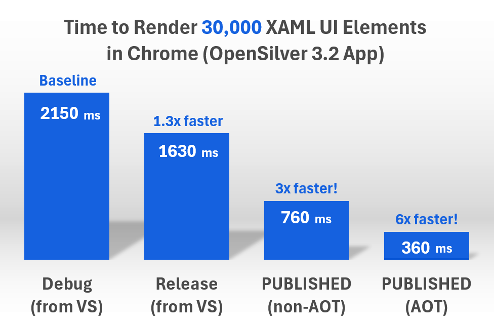 Compile the application using the Ahead-of-Time (AOT) setting. This improves speed by up to 6 times. Note that it’s not enabled by default because compilation takes significantly longer, but it’s definitely the way to go when publishing performance-sensitive apps.